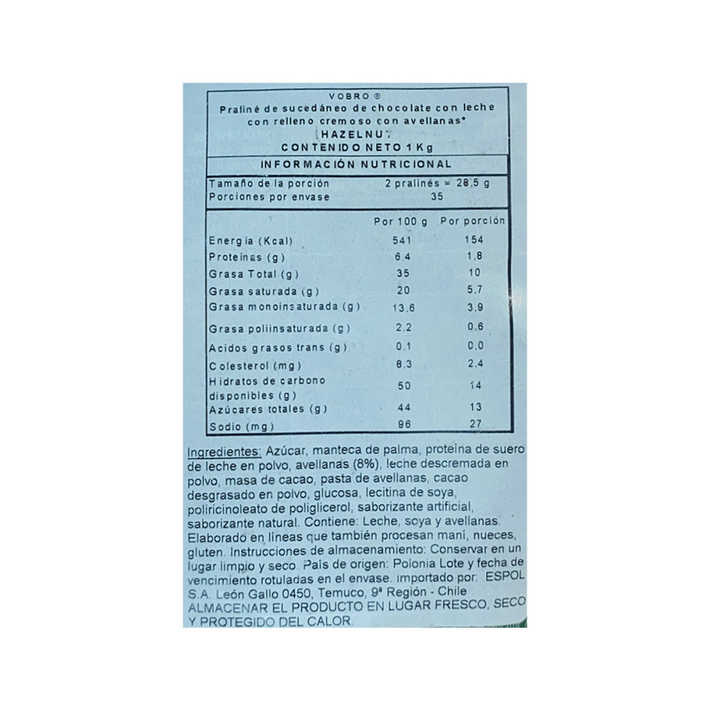 Descubre los exquisitos bombones Vobro Hazelnut Passion, una deliciosa combinación de chocolate premium relleno de avellana que despierta los sentidos. Presentados en un elegante empaque verde oscuro con detalles dorados, estos bombones son perfectos para los verdaderos amantes del chocolate gourmet. El producto destaca por su alto contenido en chocolate, avellanas selectas y una textura cremosa incomparable.