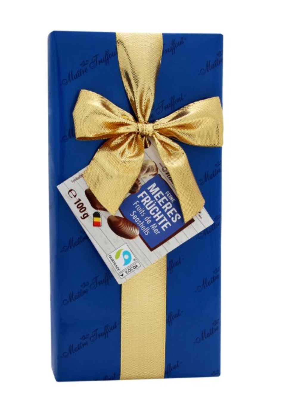 Descubre el lujo del chocolate belga Meeres Früchte de Maitre Truffout, una deliciosa selección de bombones en forma de frutos del mar con un relleno cremoso de praliné, elaborados con cacao para garantizar su calidad. Su elegante presentación en papel azul con un lazo dorado lo convierte en el regalo perfecto para ocasiones especiales o para disfrutar de un antojo sofisticado.