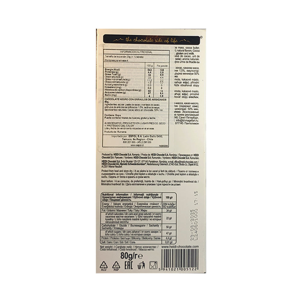 Descubre el fascinante Chocolate Dark Heidi Cranberry, una innovadora combinación vegana que fusiona el refinado chocolate negro con la vibrante acidez de los arándanos rojos. Esta tableta vegana ofrece una experiencia única donde el intenso sabor del chocolate dark se entrelaza perfectamente con trozos de cranberry cuidadosamente seleccionados. Un chocolate gourmet que despierta los sentidos con su equilibrio entre dulzura y acidez natural, creando una armoniosa experiencia de sabor.