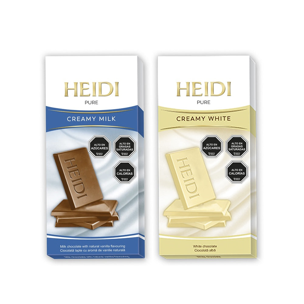 Experimenta la suavidad suprema de Heidi Pure en sus dos exquisitas variedades: Creamy Milk, un chocolate con leche enriquecido con vainilla natural, y Creamy White, un delicado chocolate blanco de textura sedosa. Esta línea premium de la reconocida marca suiza Heidi presenta tabletas elegantemente diseñadas con el logo en relieve y envueltas en empaques modernos en tonos azul y crema.