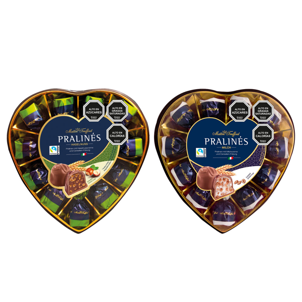 Deléitate con la exquisita colección de bombones Maître Truffout, presentados en una elegante caja en forma de corazón. Esta selección premium ofrece dos variedades irresistibles: bombones rellenos de avellana y bombones de crema de leche con cereales, ambos elaborados con ingredientes de alta calidad. Perfectos para regalar o disfrutar en cualquier ocasión especial